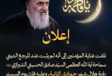 مكتب المرجع الشيرازي: الأحد أول أَيام شهر جمادى الثانية لعام 1447 هـ