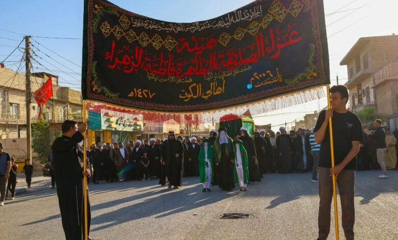 شهدت مدينة الكوت الأحد، مراسم تشييع رمزي مهيب لنعش السيدة فاطمة الزهراء (عليها السلام)، بمشاركة جموع غفيرة من أتباع أهل البيت (عليهم السلام) الذين توافدوا من مختلف أقضية ونواحي المدينة لإحياء ذكرى استشهاد الصديقة الزهراء (عليها السلام)، التي وقعت بعد خمسة وسبعين يوماً من شهادة أبيها النبي الأكرم محمد (صلى الله عليه وآله).