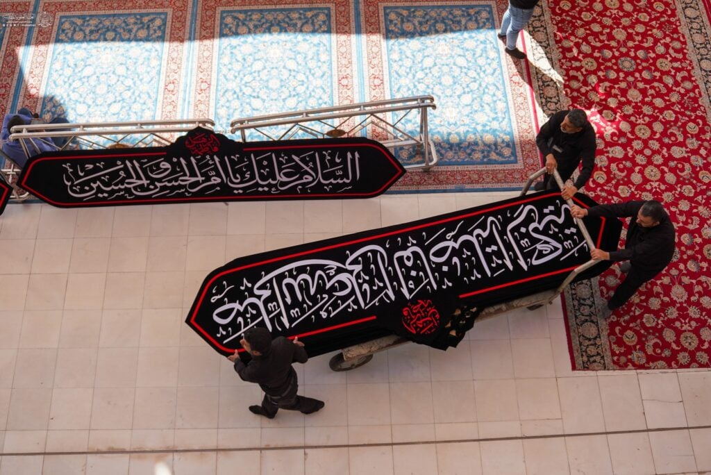 باشرت كوادر شعبة التطريز التابعة لقسم المنقوشات وإحياء التراث في العتبة العلوية المقدسة بتعليق الرايات السوداء وتوشيح أروقة الصحن العلوي المطهر بعبارات الحزن والعزاء، إيذاناً ببدء إحياء ذكرى استشهاد السيدة فاطمة الزهراء (عليها السلام).