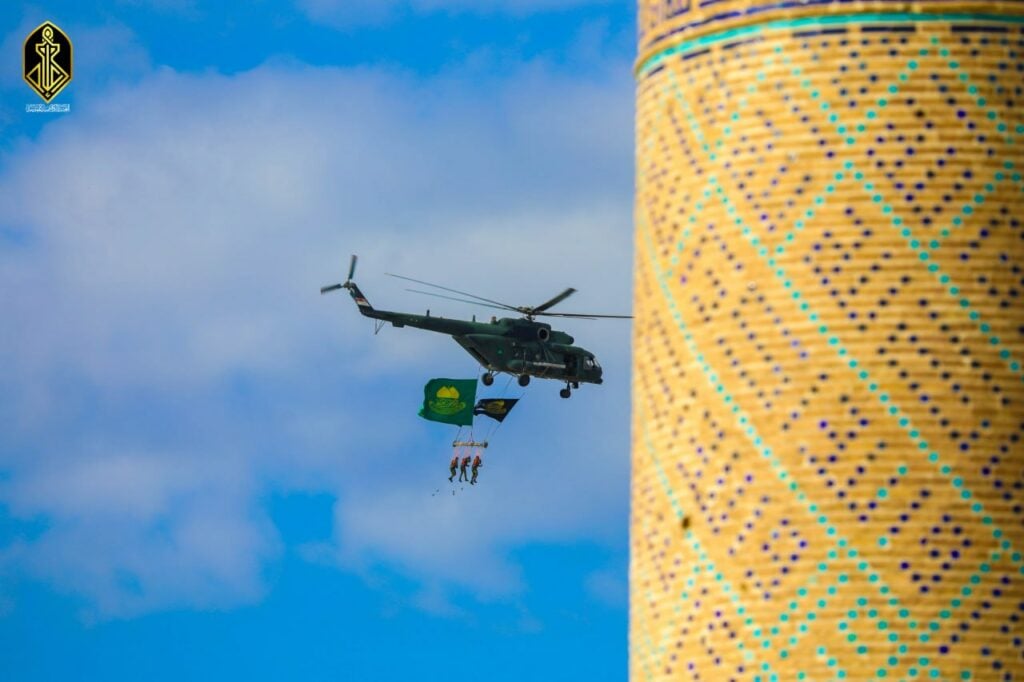 وتزيّنت السماء براية الإمامين الكاظمين الجوادين (عليهما السلام)، فيما أضفت فعاليات التحليق الجوي والقفز المظلي بُعدًا رمزيًا مؤثرًا تزامن مع مراسم تشييع النعش الرمزي للإمام الكاظم (عليه السلام)، وسط حضور واسع من الزائرين الذين امتلأت قلوبهم بالمحبة والولاء.