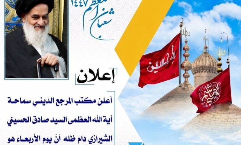 مكتب المرجع الشيرازي يعلن أن غرّة شهر شعبان يوم الأربعاء المقبل