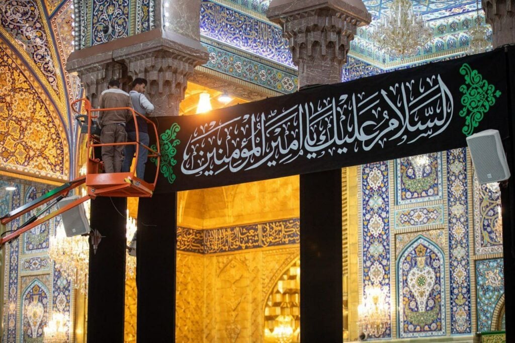 وبدأت التحضيرات مبكرًا داخل الحرم الشريف، حيث اتشحت المداخل والممرات بالرايات السوداء التي خُطَّت عليها عبارات الرثاء التي تعكس عمق الحزن الذي يخيم على محبي أمير المؤمنين (عليه السلام) في هذه الأيام. كما شهد الصحن إقامة المجالس العزائية وتوافد الزائرين من مختلف المدن لإحياء الذكرى في أجواء ملؤها الحزن والأسى.