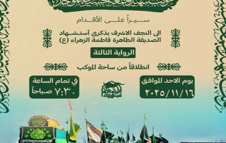 ومن المؤمل أن تصل قوافل السائرين إلى مدينة النجف الأشرف في بالتزامن مع أيام الاستشهاد، حيث سيُقام مجلس عزاء مهيب عند مرقد أمير المؤمنين (عليه السلام)، في لوحة تفيض بالحب والوفاء لصاحبة المصاب الأعظم.