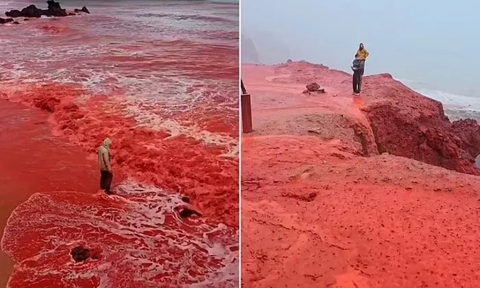 وخلال الأمطار الغزيرة، انحدرت سيول ملونة من الصخور الغنية بالمعادن، مشكلة شلالات صغيرة تركت خلفها مسارات حمراء لامعة امتدت حتى الشاطئ. ورغم أن المشهد بدا للكثيرين ظاهرة خارقة للطبيعة، فإن تفسيره علمي بالكامل؛ إذ تحتوي تربة المنطقة، المعروفة باسم “جيلاك”، على نسب عالية من أكسيد الحديد الذي يمنحها لونها الأحمر المميز.