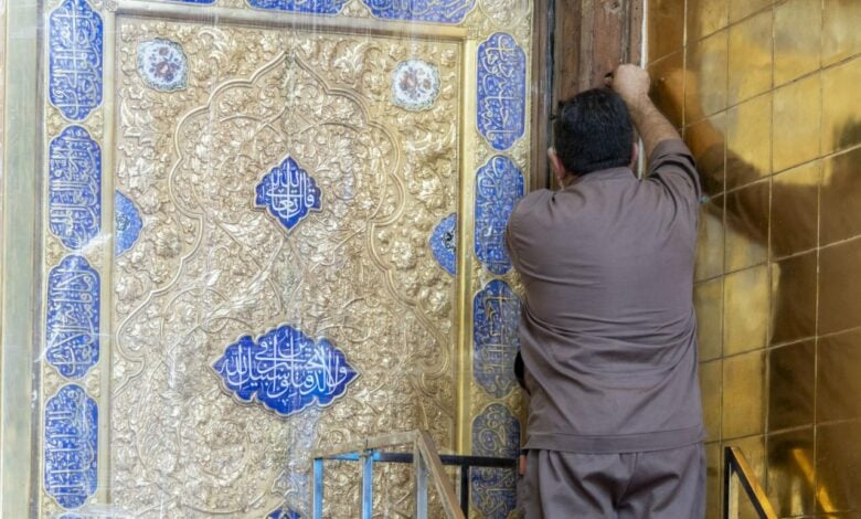 بعد صيانته وتذهيبه.. المباشرة بتثبيت باب قبلة حرم أبي الفضل العباس (عليه السلام)