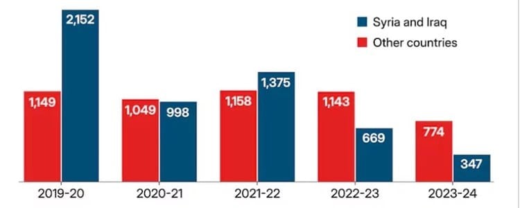وذكر التقرير أنه “بين عامي 2019 و2020، تركزت غالبية بيانات تبني د1عش للهجمات في سوريا والعراق، وبحلول عامي 2023-2024، انخفضت هذه البيانات إلى أقل من ثلثها، مع تسجيل عدد أكبر بكثير من الحوادث في مناطق أخرى، كما انخفض العدد الإجمالي للبيانات بشكل حاد، مما يُشير إلى ضعف التنظيم على المستوى الإقليمي، ولكنه لم يختفِ تمامًا”.