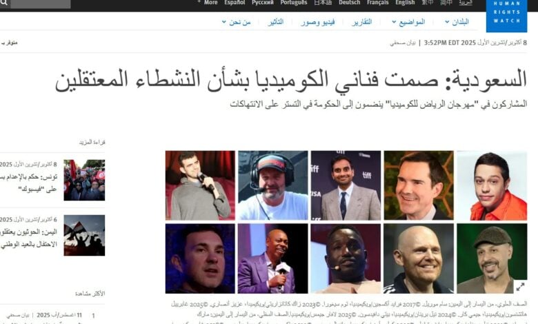 نشرت منظمة هيومن رايتس ووتش انتقادًا لافتًا للكوميديين المشاركين في “مهرجان الرياض للكوميديا” الذي أقيم بين 26 سبتمبر و9 أكتوبر 2025، بسبب عدم استخدامهم منصاتهم للدعوة إلى الإفراج عن المعارضين، والصحفيين، ونشطاء حقوق الإنسان السعوديين المحتجزين ظلماً، مثل وليد أبو الخير وناشطة حقوق المرأة مناهل العتيبي.