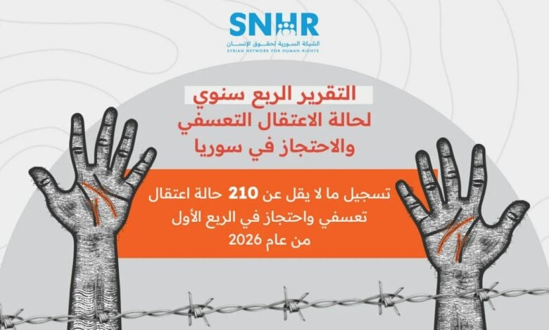 أصدرت الشبكة السورية لحقوق الإنسان تقريرها الربع سنوي حول حالة الاعتقال التعسفي والاحتجاز في سوريا خلال الفترة من كانون الثاني/يناير إلى آذار/مارس 2026، موثّقةً ما لا يقل عن 210 حالات اعتقال تعسفي واحتجاز، بينهم 11 طفلًا و3 سيدات، إلى جانب تسجيل 512 حالة إفراج من مراكز الاحتجاز المختلفة.
