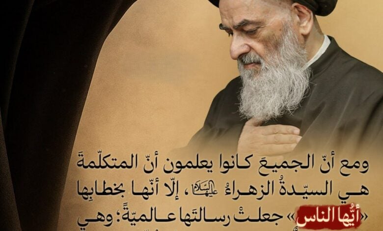 وقال سماحته: «ومع أنّ الجميع كانوا يعلمون أنّ المتكلّمة هي السيدة الزهراء سلام الله عليها، إلا أنّها بخطابها “أيها الناس” جعلت رسالتها عالمية؛ وهي رسالة يجب علينا جميعًا أن نبلغها».