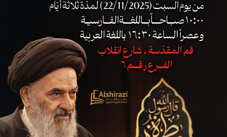 وبيّن المكتب أن بيت سماحة المرجع الشيرازي في مدينة قم المقدسة يشهد اليوم السبت إقامة مجالس العزاء الخاصة بهذه المناسبة، بحضور سماحته وجمعٍ من العلماء والفضلاء وطلبة الحوزة العلمية، إضافة إلى جموعٍ من المحبين والمعزّين من مختلف الجنسيات.