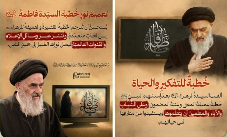 المرجع الشيرازي يدعو إلى تعميم نور خطبة السيدة الزهراء (عليها السلام) وترجمتها إلى لغات العالم