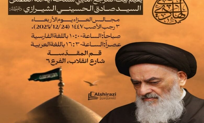 كما ذكر بأن “البيت المكرّم للمرجع الشيرازي في مدينة قم المقدسة، سيشهد اليوم الأربعاء إقامة مجالس العزاء بالذكرى الأليمة، والتي تقام على فترتين صباحية (باللغة الفارسية) ومسائية (باللغة العربية)”.