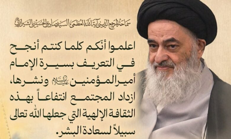 حثّ المرجع الديني الأعلى سماحة آية الله العظمى السيّد صادق الحسيني الشيرازي المؤمنين على ضرورة التعريف بسيرة أمير المؤمنين الإمام علي بن أبي طالب (عليه السلام)، مؤكداً أن المجتمع كلما انتفع من الثقافة العلوية الأصيلة كان أقرب إلى السعادة المنشودة والاستقرار الحقيقي.