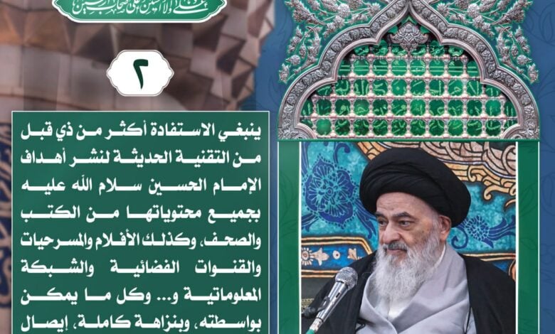 وأكد المرجع الشيرازي على أن نشر ثقافة وعلوم أهل البيت (عليهم السلام) مسؤولية عظيمة، تتطلب استثمار التكنولوجيا الحديثة بكل أشكالها لنشر الشعائر الحسينية المقدسة وتوضيح قضية الإمام الحسين (عليه السلام) التي تحمل أبعاداً إنسانية وأخلاقية عميقة تتجاوز الزمان والمكان.