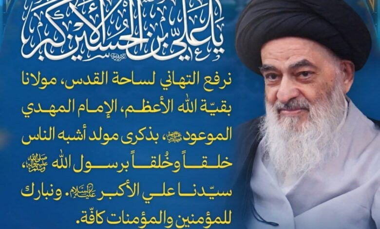 وجاء في تهنئة نُشرت على موقعه الرسمي، “نرفع التهاني لساحة القدس، مولانا بقيّة الله الأعظم، الإمام المهدي الموعود عجّل الله تعالى فرجه الشريف، بذكرى مولد أشبه الناس خلقاً وخُلقاً برسول الله صلى الله عليه وآله، سيّدنا علي الأكبر سلام الله عليه. ونبارك للمؤمنين والمؤمنات كافّة”.