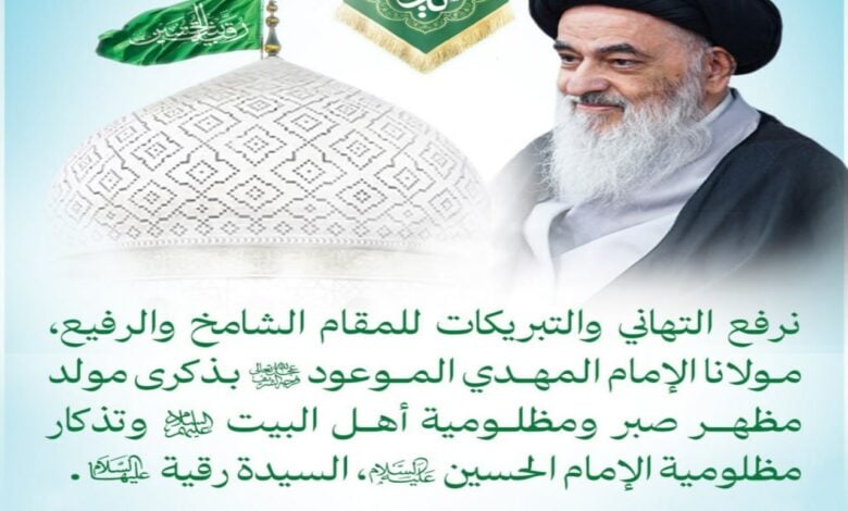 وجاء في تهنئة نشرها الموقع الرسمي لمكتب المرجعية: «نرفع التهاني والتبريكات إلى المقام الشامخ والرفيع مولانا الإمام المهدي الموعود عجل الله تعالى فرجه الشريف، بذكرى مولد مظهر صبر ومظلومية أهل البيت عليهم السلام، وتذكار مظلومية الإمام الحسين عليه السلام، السيدة رقية سلام الله عليها».