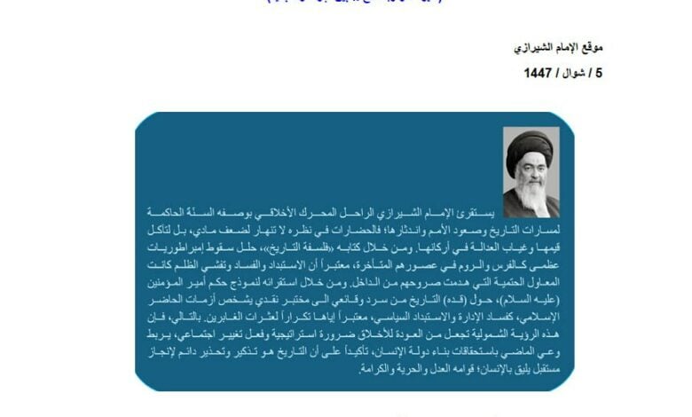 واختتم المقال بالتأكيد على أن المنهج الفكري للإمام الشيرازي يمثل دعوة متجددة لإعادة قراءة التاريخ بعين ناقدة تستخلص العبر والدروس، وتوظفها في بناء مستقبل يقوم على العدالة والحرية والتنمية، مشددًا على أن دراسة التاريخ تعد وسيلة لفهم الواقع وإصلاحه، وليس مجرد استذكار للأحداث الماضية.