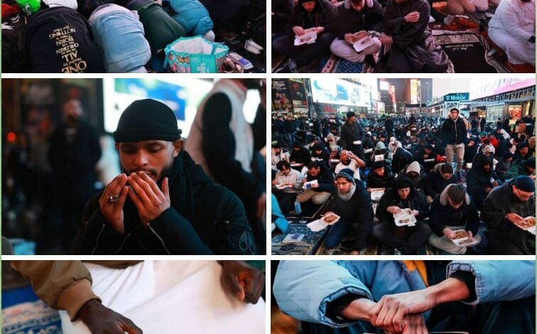 حضور واسع لمئات المسلمين في إفطار جماعي وصلاة الجماعة بساحة تايمز سكوير في نيويورك