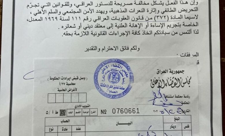 وعدّت الشكوى هذا الفعل مخالفة صريحة للدستور العراقي وتهديداً للأمن الأهلي، مطالبة باتخاذ الإجراءات القانونية وفق المادة (372) من قانون العقوبات العراقي رقم 111 لسنة 1969 المعدل، الخاصة بتجريم الإساءة للمعتقدات الدينية.