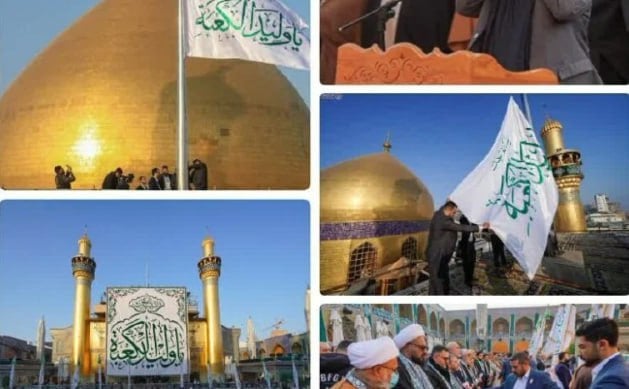 On the occasion of the auspicious birth anniversary of the Commander of the Faithful, Imam Ali (peace be upon him), the commemorative flag marking his birth was raised atop the dome of the Holy Alawi Shrine in Najaf al-Ashraf.