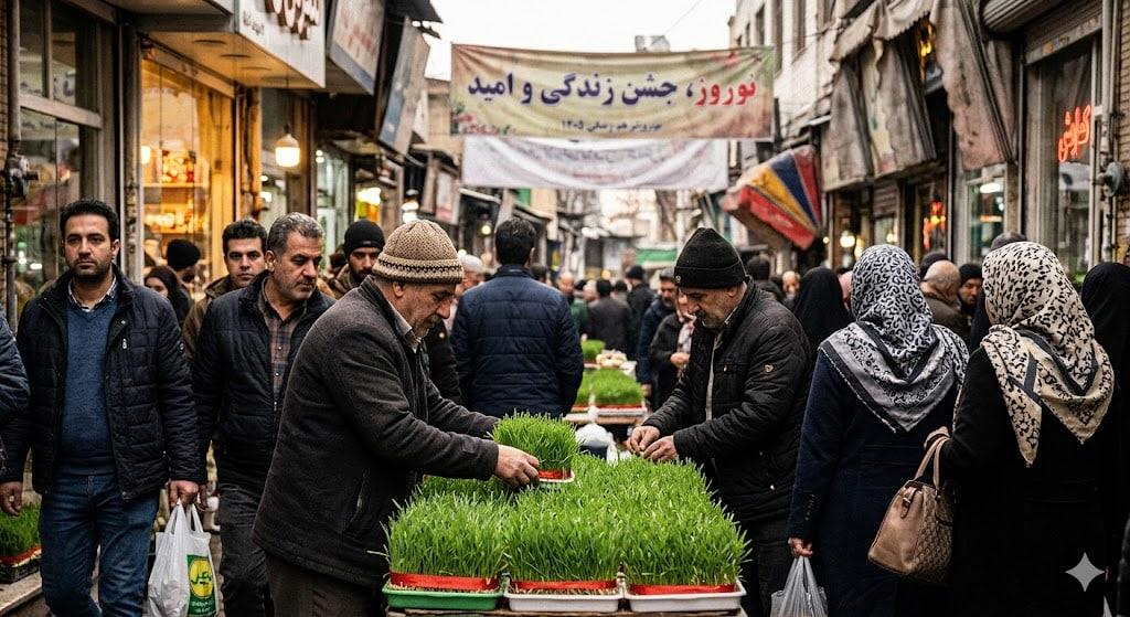 در تهران، با وجود سایه جنگ و بحران و گرانی و تعطیلی بسیاری از بازارها، مردم برای خرید سبزه، گل و ماهی قرمز تلاش میکنند تا سنتهای نوروز را زنده نگه دارند.