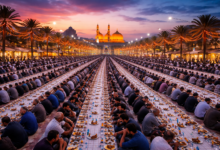 برپایی بزرگترین سفره افطار دسته جمعی زائران در شهر مقدس کربلا در ماه مبارک رمضان
