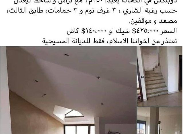 به گزارش شیعه ویوز (اخبار شیعیان جهان)؛ کانال تلگرامی لیبانیران با انتشار پستی تحت عنوان «در لبنان فروش املاک در منطقه مسیحی به مسلمان ممنوع است!»، نوشت: آگهی فروش منزلی در منطقه مسیحی نشین “کحاله” منتشر شده که در آن نوشته به مسلمان ملک نمی ‌فروشند.