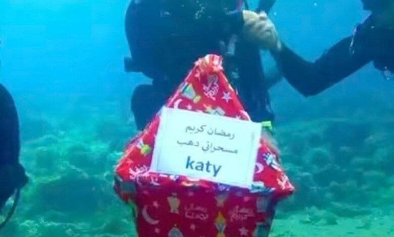 یک مربی غواصی مشهور در مصر، پیام تبریک ماه مبارک رمضان را از اعماق دریای سرخ با فانوسی بزرگ و مزین به تزئینات رمضانی اعلام کرد.