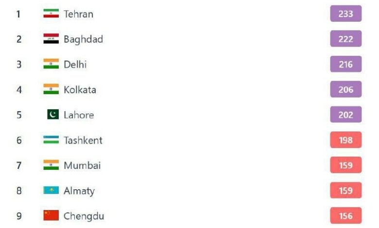 براساس تازهترین گزارش شرکت سوئیسی کیفیت هوا، هوای تهران با ثبت شاخص آلودگی ۲۳۳ وارد محدوده «بسیار ناسالم» شده و این شهر را به صدر جدول آلودهترین کلانشهرهای جهان رسانده است.