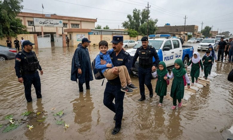 کمک پلیس به دانشآموزان پس از محاصره مدرسه در باران در کوت عراق
