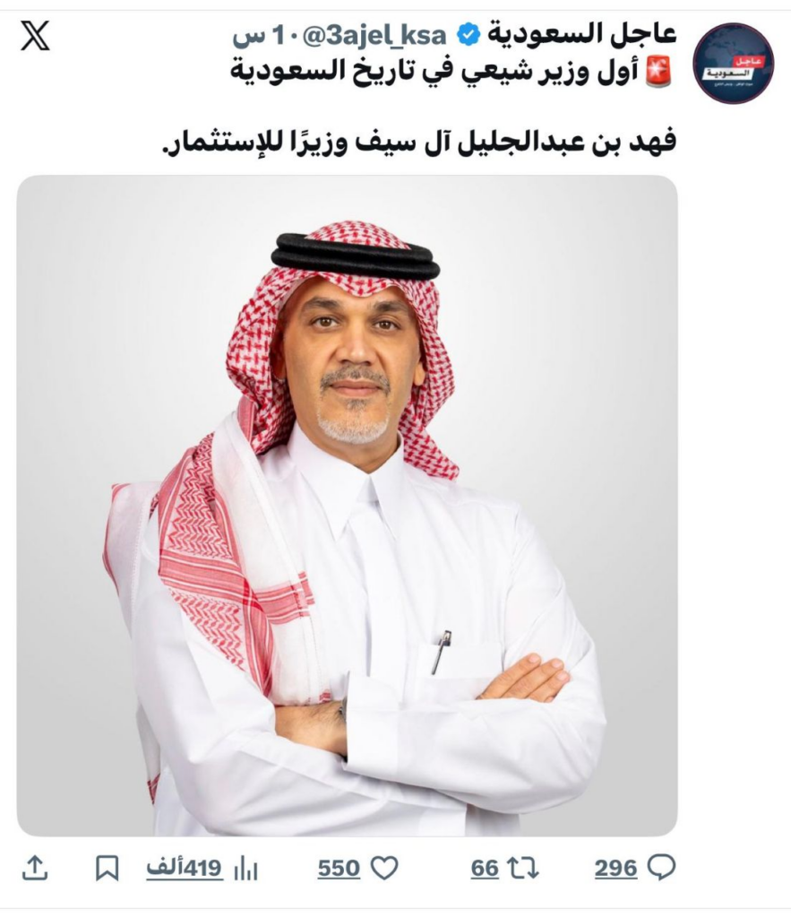 تعیین فهد بن عبدالجلیل آل سیف بهعنوان نخستین وزیر شیعه در تاریخ عربستان سعودی و تصدی وزارت سرمایهگذاری