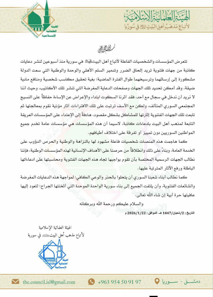 هشدار جدی هیئت علمای شیعه سوریه نسبت به انتشار مطالب فتنهانگیز؛ مطالبه برخورد قانونی با عاملان تحریف و تهدید همزیستی مسالمت آمیز