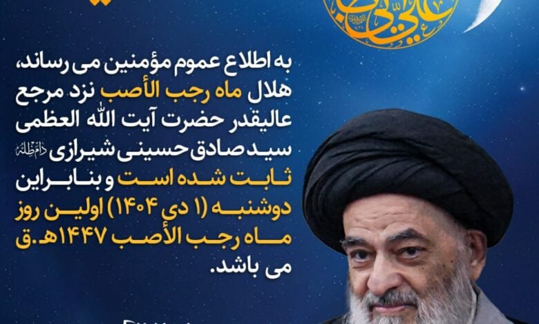 در این بیانیه آمده است: به اطلاع عموم مؤمنین مى رساند، هلال ماه رجب الأصب نزد مرجع عالیقدر حضرت آیت الله العظمى سید صادق حسينى شیرازى دام ظله ثابت شده است و بنابراين دوشنبه (۱ دی ۱۴۰۴) اولین روز ماه رجب الأصب ۱۴۴۷هـ.ق مى باشد.