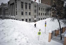 TOPSHOT – A pedestrian crosses a street used for temporary snow storage…