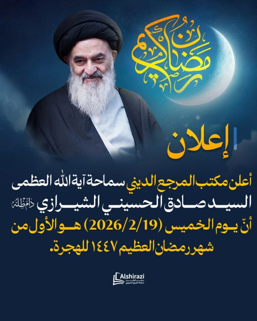 بیت مرجع عالی قدر آیۃ اللہ العظمیٰ سید صادق حسینی شیرازی دام ظلہ قم ایران نے اور اعلان کیا کہ جمعرات کو یکم رمضان المبارک ہے۔