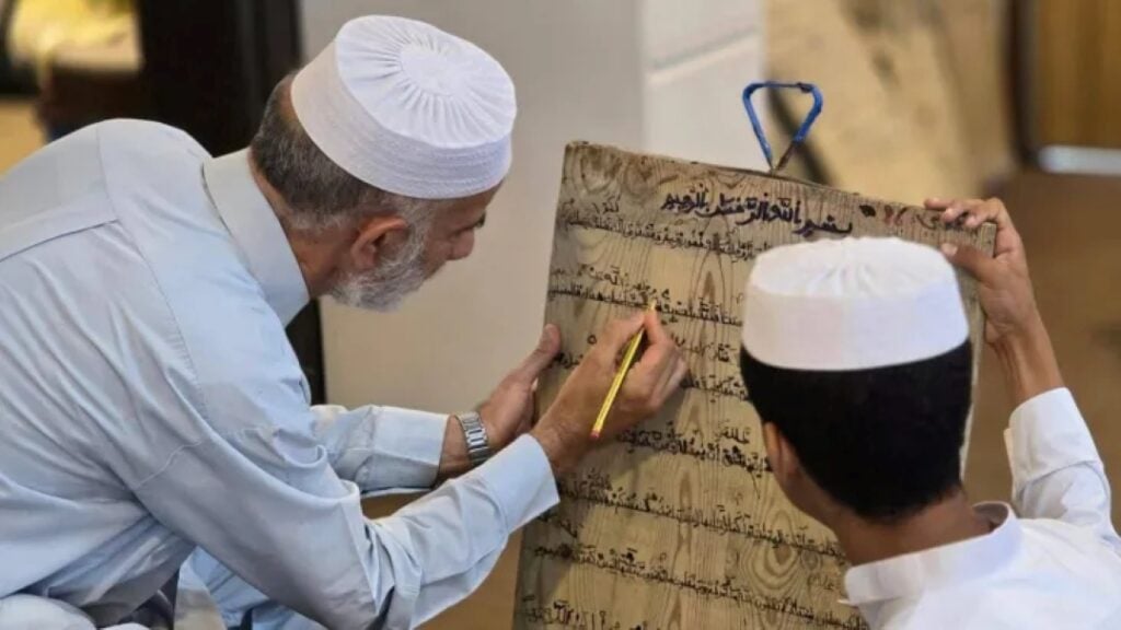 لیبیا کے مشرقی طرابلس علاقہ کے شہر تاجورا میں واقع "قرآنی مدرسہ شیخ احمد الناس” کے طلبہ لکڑی کی تختیوں کے ذریعہ روایتی انداز میں قرآنِ کریم حفظ کر رہے ہیں۔