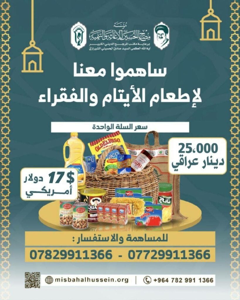 ادارہ مصباح الحسين علیہ السلام نے عراق کے اندر اور عالمی سطح پر موجود مخیر حضرات اور فلاحی سرگرمیوں میں دلچسپی رکھنے والے افراد سے اپیل کی ہے کہ وہ ماہِ مبارک رمضان کے موقع پر یتیموں اور ضرورت مند خاندانوں کے لئے غذائی سبد (راشن پیکج) کی تیاری میں حصہ لیں۔